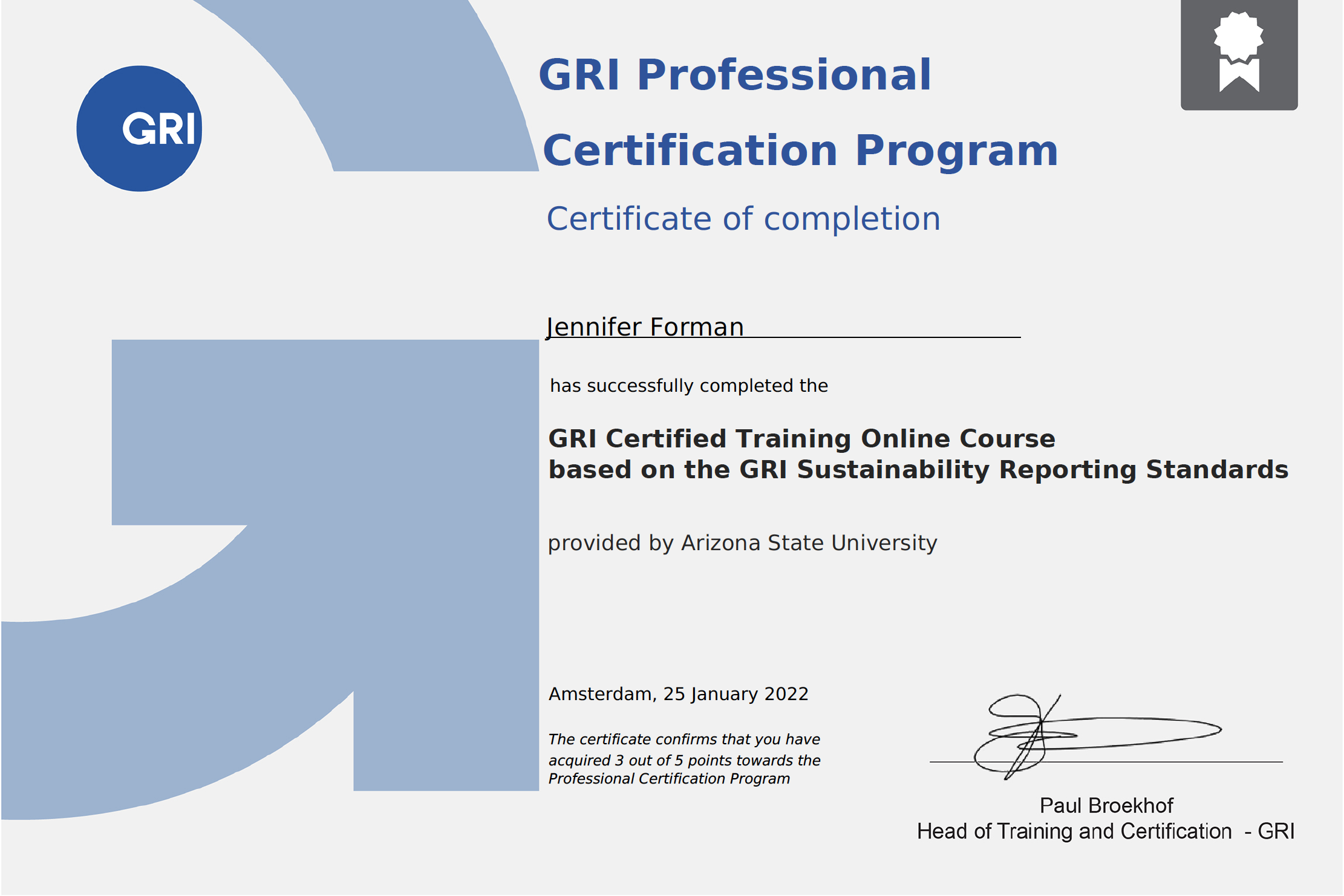 Jennifer holds professional certifications in Sustainable Business Strategy (Harvard Business School, Online), Corporate Social Responsibility (University of Colorado) and GRI Standards for Sustainability Reporting (GRI Academy). She is an avid proponent of corporate purpose, workplace diversity, equity & inclusion, and integrating environmental and social sustainability practices into all facets of business.